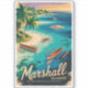 Marshall Islands retro vector travel design. The Marshall Islands are a remote Pacific nation known for crystal-clear lagoons, pristine coral reefs, and world-class diving. From historic Bikini Atoll to traditional island culture, the islands offer a peaceful escape surrounded by stunning tropical waters.