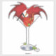 Un mignon petit dragon rouge se dresse jusqu'à une olive verte dans un verre de martini