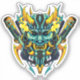 Ce design complexe présente une réinvention futuriste d'un masque Oni japonais traditionnel. Le masque est doté d'un visage cybernétique menaçant, aux yeux jaunes brillants et aux cornes acérées. Des éléments métalliques et des fils ornent le masque, suggérant une fusion de mythologie ancienne et de technologie moderne. Deux épées de samouraï stylisées encadrent le masque, ajoutant au sentiment général de puissance et d'agression. La palette de couleurs bleu et or crée un contraste visuel saisissant.