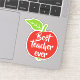 Meilleur enseignant Sticker de pomme rouge texte blanc jamais. Ce joli design typographique comprend une pomme rouge avec une feuille verte et le texte "Meilleur Enseignant Jamais" en blanc. Montrez à votre professeur préféré votre appréciation avec cet autocollant fantaisiste coupé baiser.