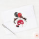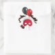 Autocollant rond avec l'image d'un masque à plumes rouges, ballons rouges et noirs, un coeur en rubis et un coeur à paillettes noires. Voir collant vinyle taillé sur mesure, confetti, sac de faveur, ballotin, étiquette de faveur, sacs cadeaux, étiquette et papier d'emballage. Voir l'ensemble de la collection Cancan Sticker dans les INVITATIONS | Section Stickers & Étiquettes.