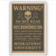 Cette affiche de style vintage présente un avertissement institutionnel glaçant de l'Université Miskatonique contre la lecture ou la manipulation du Necronomique. Étiqueté "Précaution interdite", elle évoque le ton des campagnes de sécurité publique des années 1940 avec une tournure d'horreur cosmique. Idéal pour les bibliothèques, les salles d'études ou les murs de n'importe quel lecteur de mythos dévoué.