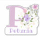 Personnalisez n'importe quel article avec un nom et une initiale avec un autocollant de découpe Floral Design. Le nom de l'exemple est Petunia.