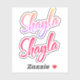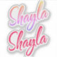 Nom de Shayla en écriture de caractères cursive. Deux copies. Une copie est un dégradé pastel de jaune, orange, rose et bleu. Une copie en rose-rouge profond.