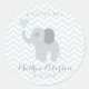 Autocollant rond qui va avec une carte de faire-part de naissance pour un petit garçon avec un éléphant mignon et un coeur, lettrage manuel et un motif chevron.