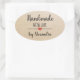 Un autocollant ovale moderne "fait main avec amour" avec une police noire sur un arrière - plan en carton embelli par un coeur rouge mignon. Customiser du texte.