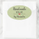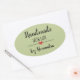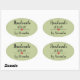 Autocollant ovale moderne "fait main avec amour" avec une police noire sur un arrière - plan vert sage agrémenté d'un coeur rouge mignon. Customiser du texte.
