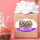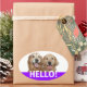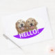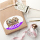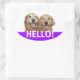 Dis bonjour ! Ces autocollants comportent une photographie de deux chiens de repérage dorés souriants, avec le mot HELLO ! en blanc sur un arrière - plan violet. Entièrement personnalisable ! Ajoutez du texte, si vous le souhaitez.
