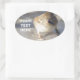 Portrait avant d'un moineau de maison avec une graine de tournesol dans son bec et une pose déterminée. Il a gagné la semence. Autocollant ovale amusant. Personnalisable . Vous pouvez modifier l'image et modifier ou supprimer le texte modèle.
