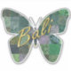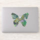 Autocollant vinyle taillé sur mesure avec l'image d'un papillon batik patchwork en diverses estampes et nuances de vert avec un peu de violet. "Bali" est imprimé en or. Voir l'ensemble de la collection Bali Retreat Sticker dans les INVITATIONS | Section Stickers.