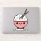 Un autocollant coupé mignon avec un adorable bol rose de riz blanc. Le bol a un joyeux visage de kawaii et le riz a deux baguettes qui stockent la rivière. Ci-dessous, une pièce de théâtre sur des mots disant "Ayez du riz !" en texte noir.