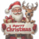 Le Père Noël et un renne joyeux tiennent un panneau festif de Joyeux Noël au milieu de la neige qui tombe, diffusant la joie des fêtes, la chaleur, le charme ludique et la célébration en famille pour les cartes de vœux saisonnières et les créations.