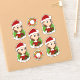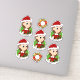Ensemble de sept autocollants en vinyle coupé avec l'illustration d'une jolie petite fille souriante et joyeuse aux cheveux longs et marron, vêtue de vêtements de Noël et portant un casquette de Père Noël rouge, sur un arrière - plan vert ; cinq autocollants de la fille et deux autocollants avec une couronne de Noël ; avec un modèle de texte personnalisable pour votre nom ou message