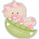 Pois mignon en pod bébé fille en rose et nom Sticker. Ce design adorable présente une douce petite fille avec des vêtements motifs roses et blancs en vichy un arc et une sucette. Il est placé dans un poid vert avec nom et deux coeurs.