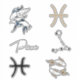 Empêche deux symboles d'astrologie du poisson dans une page d'autocollant vinyle taillé sur mesure avec six images différentes. Délicats dessins à l'encre de ligne, symboles en noir et or, une constellation noire d'étoiles, et texte Pisces dans une fabuleuse police manuscrite noire.