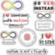 Un assortiment d'autocollants autistes pour quelqu'un qui est effectivement autiste. Le symbole infini couleur arc-en-ciel, allez rouge à la place, j'ai coeur à remuer, et d'autres messages positifs sous forme d'autocollant.
