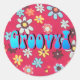 Autocollant rond avec le mot-clé "Super!" des années 60 sur une image vintage des années 60 de fleurs jaunes, bleues, orange et violettes sur le rouge. Voir sac de faveur, ballotin, étiquette de faveur et étiquette correspondant. Voir l'ensemble de la collection Psychedelic Sticker des années 60 dans les INVITATIONS | Section Stickers & Étiquettes.