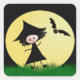 Joyeux Halloween ! Donnez des autocollants mignons cette Halloween ! Cette image, qui s'adresse aux enfants, présente une mignonne sorcière et sa chauve-souris qui s'amuse à la lumière de la pleine lune.