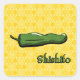Un piment de shishito vert, également connu sous le nom de kkwari-gochu en coréen, est décoré de motifs inspirés par les motifs coréens et s'assied sur un arrière - plan jaune avec une version plus petite du même motif et un étiquette de script dans le coin. Ce poivre doux est consommé partout en Corée et au Japon, crus et cuits.