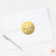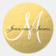 Sticker Gold Black Wedding Favor avec nom de mariée et de mariée et nom de famille monogramme initial. Peut également être utilisé pour les joints d'enveloppe de Faire-part de mariage. Entièrement personnalisable. Elke Clarke© pour MonogramGallery à Zazzle. Autres couleurs disponibles dans notre boutique. Effet photo imprimé de feuille d'or dans l'arrière - plan avec monogramme blanc et texte en script noir. Parfait pour un thème mariage noir et or.