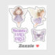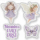 Two cute, ethereal fairies in purple dresses and flower crowns, an intricately detailed butterfly, and and a customizable fairy first sticker are included in this fairy party favor sticker collection.
