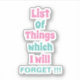 Rappel amusant pour les gens oublieux N'oubliez pas Sticker Carré avec une citation de rappel amusante - Liste des choses que j'oublierai! ! ! Attention à tous les gens oublieux ! Il est temps pour un rappel collant de ne jamais oublier le héros méconnu de l'étiquetage et de l'organisation : l'autocollant carré ! Donc, la prochaine fois que vous essayez de garder une trace des choses ou d'ajouter un toucher à vos effets personnels, n'oubliez pas vos auto-collants carrés fiables! C'est le secret pour les oublieux et les créatifs. Stick it, étiquette it, et conquérir le monde, un carré à la fois!