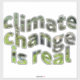 Cet autocollant en vinyle est décoré d'un texte taillé dans une image d'une montagne recouverte d'arbres luxuriants. Les lettres du texte "le changement climatique est réel" sont déformées en texte ondulé par rapport au texte normal pour souligner visuellement que notre changement climatique est réel et apparent. Il imite aussi la chaleur radiante que l'on voit sur la surface chaude causée par un motif météorologique anormal sur la terre.