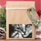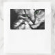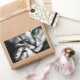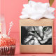 Photo en noir et blanc d'un chat-tabby aux yeux verts qui met un adorable petit chaton dans ses caissons.
