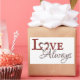 Ce design d'autocollant présente le texte "Amour toujours" avec le "o" dans Amour comme une couronne de cœur de tulipe rouge. -