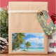 Colloque photo rectangulaire avec un palmier accroché sur une plage de sable blanc d'une île tropicale de l'océan Pacifique appartenant à l'archipel de Tahiti, Polynésie française.