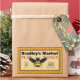 Image graphique d'un bourdon jaune et noir sur un subtil motif arrière - plan aux couleurs chaudes, entouré d'un cadre orange avec des vignes et des feuilles. ❀ Customisez l'autocollant de pot de miel avec votre nom d'entreprise ou votre marque, le poids du miel et la date "Meilleur avant", ou si vous préférez, changez le texte en "Date de / Récolte".