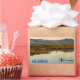 Seul dans le désert. Un canot surplombe l'eau glacée du lac à l'intérieur de l'Alaska. Au loin la taïga typique et les montagnes. Le texte "Alaska" apparaît également. Cette image provient d'une photographie du United States Fish and Wildlife Service.
