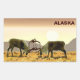 Deux taureaux de caribou luttent pendant l'automne rut dans l'extrême nord tandis que le soleil se couche dans l'arrière - plan. Le texte "ALASKA" apparaît également.