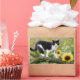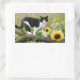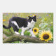 Un chat mignon, tuxedo motif bicolor noir et blanc, European Shorthair, marchant sur une branche d'arbre dans un jardin avec des tournesols fleuris. Les chats ont un sens de l'équilibre exceptionnel et ils obtiennent un équilibre gracieux. Photo Katho Menden. Cet autocollant est une idée cadeau pour les amoureux de les chats.