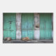 Un autocollant rectangulaire avec des chiens errants dormant dans la rue devant de vieilles portes vertes sales à Katmandou, la capitale du Népal.