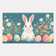 Lapin blanc mignon avec un fond de fleurs et des œufs de Pâques de chaque côté du lapin