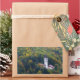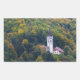 Un autocollant photo rectangulaire d'une église entourée d'arbres dans une forêt aux couleurs d'automne sur les collines autour du lac Bled en Slovénie en automne.