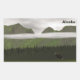 Un tableau numérique de conifères verts et de montagnes en Alaska par jour très gris et nuageux. Un orignal au premier plan prête de l'échelle à la scène. Le texte "Alaska" apparaît également.