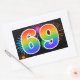 Cette conception d'autocollant amusante et vibrante présente un motif coloré de feux d'artifice de célébration, ainsi que le nombre "69" avec un motif de dégradé inspiré d'un arc-en-ciel multicolore, sur un fond de couleur noire. Des autocollants comme celui-ci pourraient peut-être être utilisés lors d'une fête célébrant le soixante-neuvième anniversaire de quelqu'un, ou peut-être pour un soixante-neuvième anniversaire de mariage d'un couple, ou un autre événement 69. [~Z0000324]