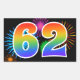 Cette conception d'autocollant amusante et vibrante présente un motif coloré inspiré de feux d'artifice de célébration, ainsi que le nombre "62" ayant un motif de dégradé multicolore semblable à un arc-en-ciel, sur un fond de couleur noire. Des autocollants comme celui-ci pourraient être offerts en petit cadeau lors de la célébration du soixante-deuxième anniversaire de quelqu'un, ou peut-être pour le soixante-deuxième anniversaire de mariage d'un couple, ou un autre événement 62ème.
