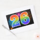 Cette conception d'autocollant amusante et vibrante présente un motif coloré inspiré de feux d'artifice de célébration, ainsi que le nombre "26" ayant un motif de dégradé arc-en-ciel multicolore, sur un fond de couleur noire. Des autocollants comme celui-ci pourraient être utilisés lors d'une fête pour célébrer le vingt-sixième anniversaire de quelqu'un, ou peut-être pour un vingt-sixième anniversaire de mariage de couple, ou un autre événement 26ème.