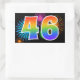 Ce design d'autocollant amusant et vibrant présente un motif coloré inspiré de feux d'artifice de célébration, ainsi que le nombre "46" avec un motif de dégradé inspiré d'un arc-en-ciel multicolore, sur un fond noir. Des autocollants comme celui-ci pourraient être utilisés lors d'une fête célébrant le quarante-sixième anniversaire de quelqu'un, ou peut-être pour le quarante-sixième anniversaire de mariage d'un couple, ou un autre événement marquant le 46ème anniversaire.