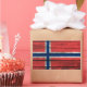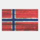 This rugged design fethe flag of Norway painted on old wooden boards. The planks of wood have a weathered look with peeling paint visible throughout. This unique Norvégigian flag pattern is unique