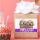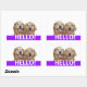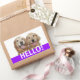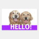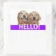 Dis bonjour ! Ces étiquettes ont une photo de deux chiens de repérage dorés souriants, avec le mot HELLO ! en blanc sur un arrière - plan violet. Entièrement personnalisable ! Ajoutez du texte, si vous le souhaitez.