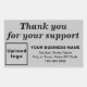 Autocollant personnalisable avec Merci de message pour votre support. Sticker pour apprécier le soutien de vos clients ou clients. Vous pouvez également l'utiliser comme matériel de marketing pour faire de la publicité pour votre entreprise et pour promouvoir votre marque de commerce ou pour sensibiliser votre marque. Les dessins sont des textes noirs en forme d'arrière - plan gris et de rectangle. Pour customiser cet autocollant, téléchargez votre logo d'entreprise, tapez votre nom d'entreprise ou de société, votre adresse et votre numéro de téléphone. Après avoir téléchargé le logo et tapé des textes, veuillez vérifier l'apparence. Si l'apparence vous plaît, vous pouvez passer votre commande maintenant. Si vous avez besoin de redimensionner et déplacer le logo et les textes pour tenir sur cet autocollant, s'il vous plaît changer dans l'outil de conception. Vous pouvez également effectuer d'autres modifications en fonction de l'apparence que vous préférez dans l'outil de conception, comme changer la couleur arrière - plan, la couleur de police et le style de police.