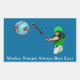 Une femme batteur, représentant Mère Nature, frappe un globe terrestre ressemblant à un baseball. Le texte "Mother Nature Always Bats Dernier" apparaît également. Causer des changements dans l'environnement peut avoir des conséquences inattendues et indésirables. Choisissez votre propre couleur arrière - plan.