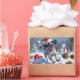 Un Griffon de pointe À poils durs plein d'entrain parcourt joyeusement la scène hivernale enneigée, portant un casquette de Noël rouge festif. Ce design animé met en valeur le manteau brun de la race, le patrimoine de chasse et la personnalité affectueuse tout en capturant la chaleur et la joie de la saison des fêtes. Un moment d'hiver plein de charme festif et chaleureux.