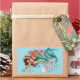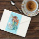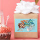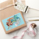 Sirène aux cheveux rouges portant des bijoux en or. La sirène a une queue turquoise, verte et bleue. Tout autour de l'émeraude se trouve un hippocampe, des coquillages de méduses et une bouteille d'eau, le tout dans un décor bleu