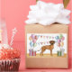 L'illustration originale de Destei d'un mignon chien de race Rhodesian Ridgeback. Le chien est placé dans un cadre d'anniversaire coloré avec des ballons d'anniversaire de couleur pastel, des cadeaux et une bannière de bunting. Les couleurs pastel sont le rose, le vert, le bleu, le rouge, l'orange et le violet. Le chien est debout sur une texture de plancher de bois jaune et l'arrière - plan a un motif de pois de couleur pastel ludique.