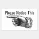 Cet autocollant rétro contient le dessin d'une main avec doigt pointu. Il se montre à gauche et dit "s'il vous plaît notez ceci". Il peut être utilisé pour indiquer le danger ou quelque chose d'important. Le design est classique dessiné à la main (coupe de bois) et provient d'un vieux livre. L'utilisation de cet article transmettra tout avis que vous voulez que votre client ou visiteur prenne, mais dans un style élégant et vintage. Idéal pour la boutique d'antiquités de n'importe quel endroit où vous ne voulez pas troubler l'ambiance intemporelle avec une enseigne moderne.